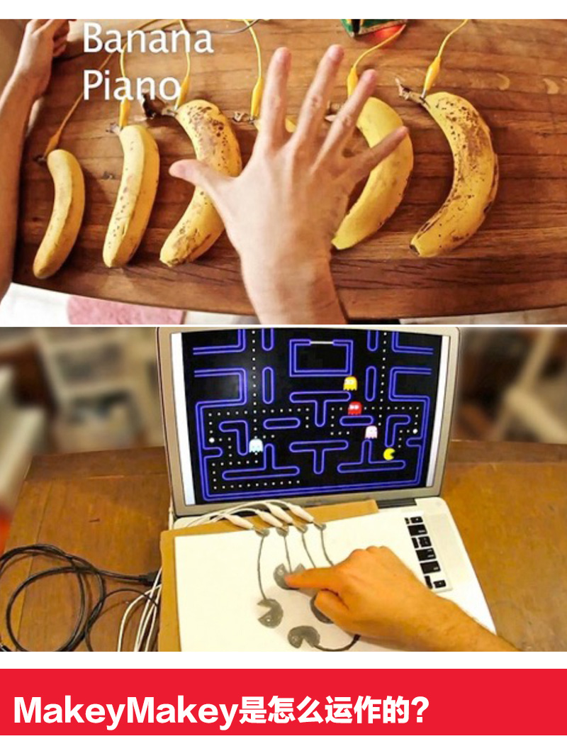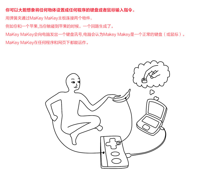 Makey Makey是21世紀的一項發(fā)明,該產(chǎn)品對于初學者和專家來說是一個簡單的套件工具,它結(jié)合互聯(lián)網(wǎng),可以使日常用品變成觸摸板,那么我們可以利用它做些什么呢?那就要看你的咯! 使用MaKey MaKey,僅僅用幾個鱷魚嘴彈簧夾連接到Makey Makey電路板上,比如你和一根香蕉。當你觸摸香蕉的時候,Makey Makey向你的電腦發(fā)送一個連接提示消息,而你的電腦會誤以為Makey Makey是一個鍵盤或鼠標,因此,它可以與任何程序或網(wǎng)頁一起工作,因為所有的程序和網(wǎng)頁都需要鍵盤或鼠標輸入。Make+Key=Makey Makey!